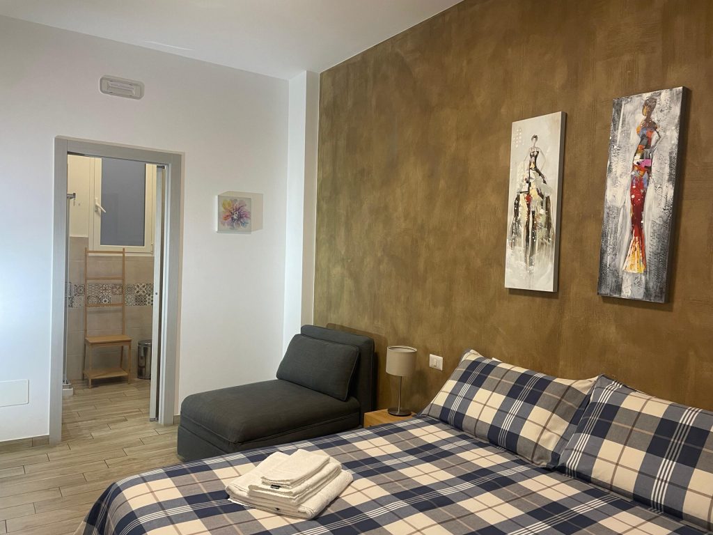 Camera familiare, composta da letto matrimoniale e divano letto con bagno privato in camera.